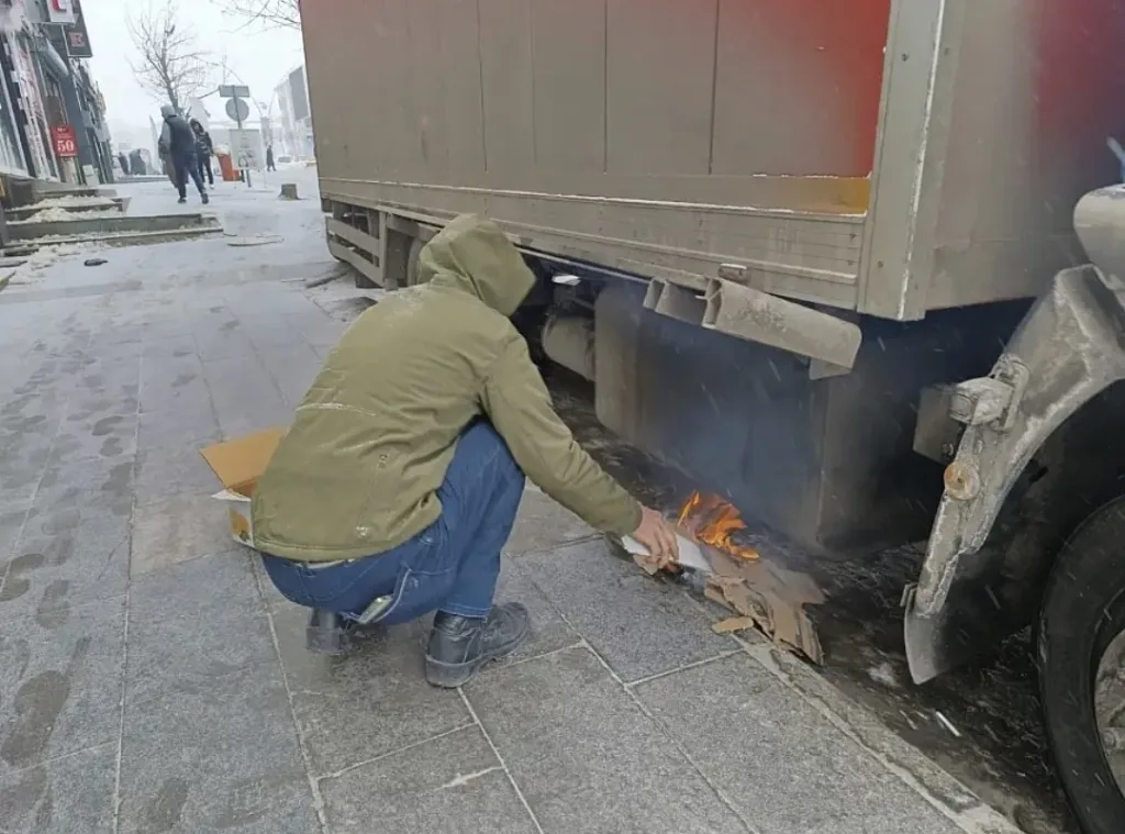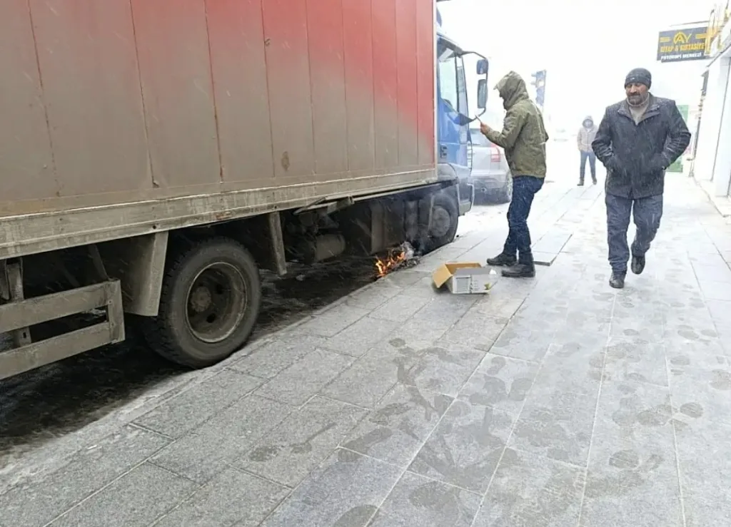 Son olarak, Cumhuriyet Caddesi’nde park halinde bulunan bir aracın yakıt deposunun donması sonucu sürücü Hasan Altun büyük bir çaba harcadı. Aracını çalıştırabilmek için çeşitli yöntemler deneyen Altun, sonunda araç altına karton koyarak küçük bir ateş yaktı ve yakıt deposunu ısıtmaya çalıştı.